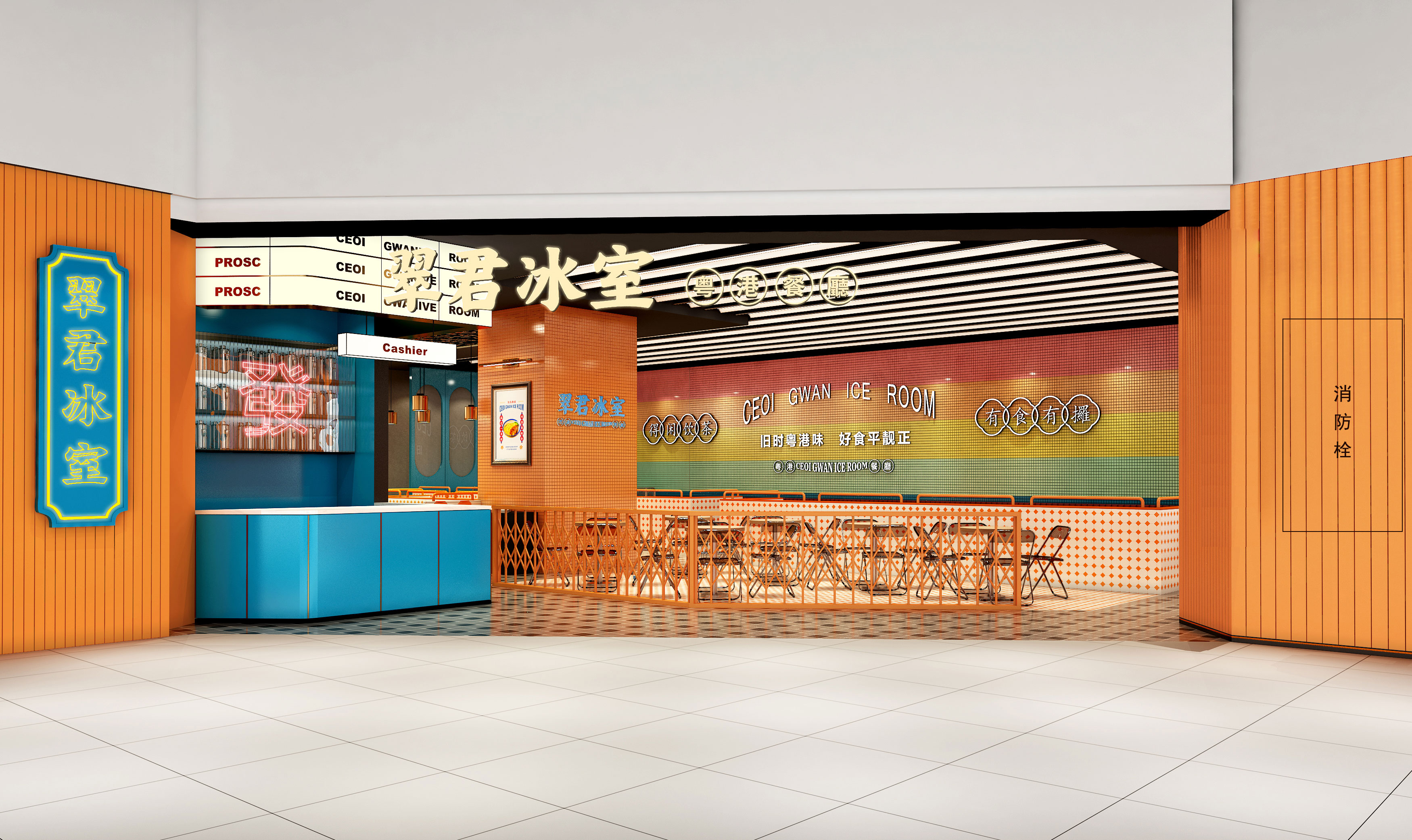 翠君冰室是一家港式茶餐廳,主要提供熱菜、粉面、茶飲、燒臘等產(chǎn)品為主,并提供多種小吃。整個(gè)空間以橙色、紅色、藍(lán)色為主色調(diào),在文化塑造、主題色彩、空間體驗(yàn)、裝飾美陳等多維度闡釋港式餐飲文化。